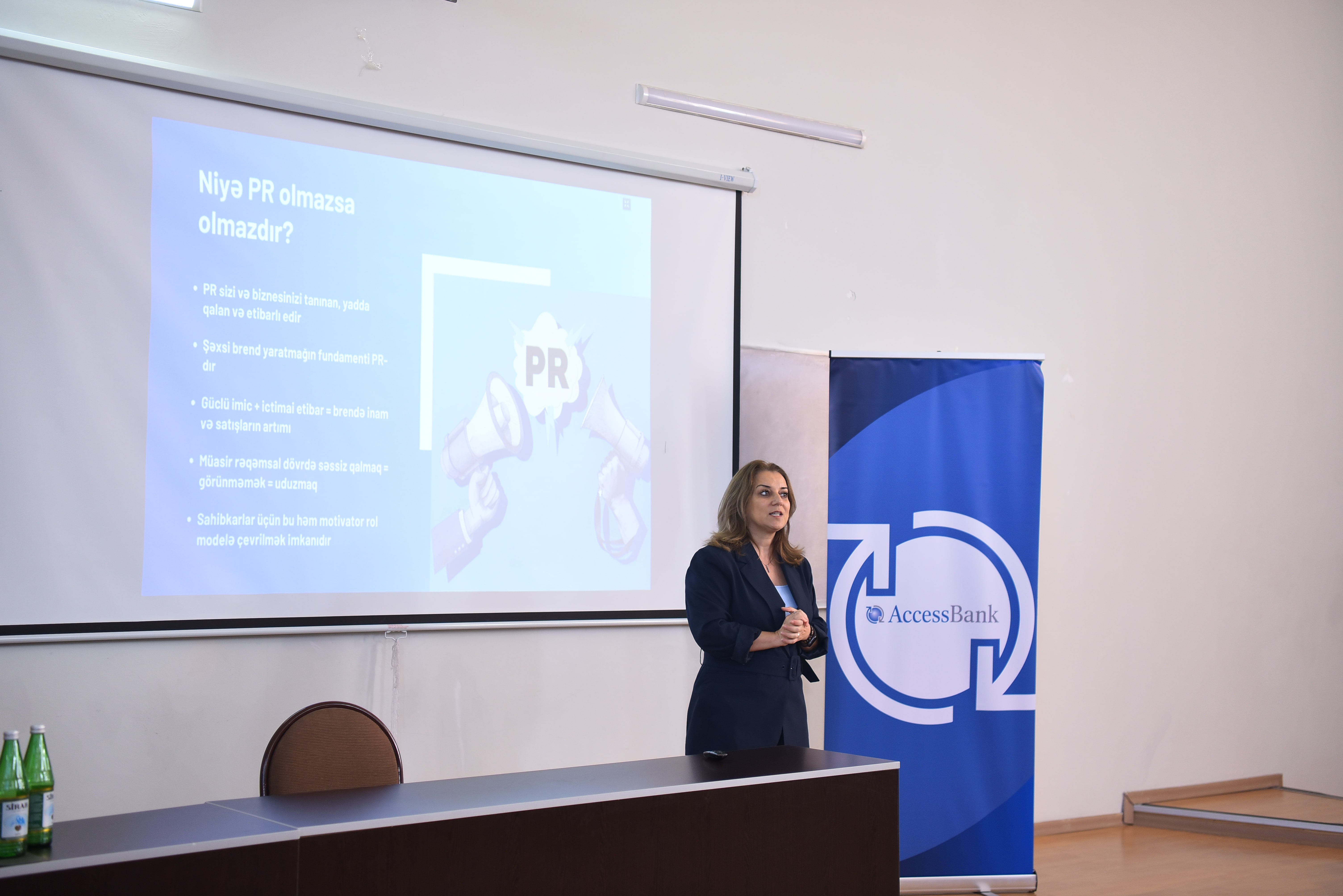 Tədbiri fakültə dekanı, dosent Loğman Abdullayev açaraq iştirakçıları salamlayıb və təlimin əhəmiyyətindən danışıb. Qeyd edib ki, AccessBank tərəfindən maliyyə mövzusunda təşkil olunan bu tədbir tələbələrin peşə yönümünün dəstəklənməsi baxımından mühüm əhəmiyyət kəsb edir. Eyni zamanda tələbələrin gələcək karyera inkişafına müsbət təsir göstərərək, onların praktik bilik və bacarıqlarının formalaşmasına töhfə verir. Dekan həmçinin AccessBank ilə universitet arasında mövcud əməkdaşlıq və tələbələrin bankda təcrübə keçmək imkanları barədə də danışıb. Sonra AccessBankın Təhsil və inkişaf şöbəsinin rəhbəri Xumar Hüseynova “Maliyyə savadlılığı”, Biznes partnyorluq şöbəsinin rəhbəri İlhamə Rüstəmli “Davamlı inkişaf, karyera planlaması”, PR və daxili kommunikasiyalar üzrə meneceri Ülviyyə İsmayılova isə “Sahibkarlar üçün PR: Lüks deyil, zərurətdir” mövzularında təqdimatla çıxış ediblər. Məruzəçilər maliyyə savadlılığının şəxsi inkişaf və karyera planlaşdırılmasında rolu, düzgün maliyyə qərarlarının qəbul edilməsi, təhlükəsiz bank əməliyyatları, eləcə də rəqəmsal bankçılıq xidmətlərindən düzgün istifadə və ictimaiyyətlə əlaqələrin əhəmiyyəti barədə məlumat veriblər. Təlim zamanı tələbələrin maliyyə bazarları, şəxsi büdcənin idarə olunması, bank xidmətlərindən səmərəli istifadə və müxtəlif layihələrlə bağlı çoxsaylı sualları cavablandırılıb.