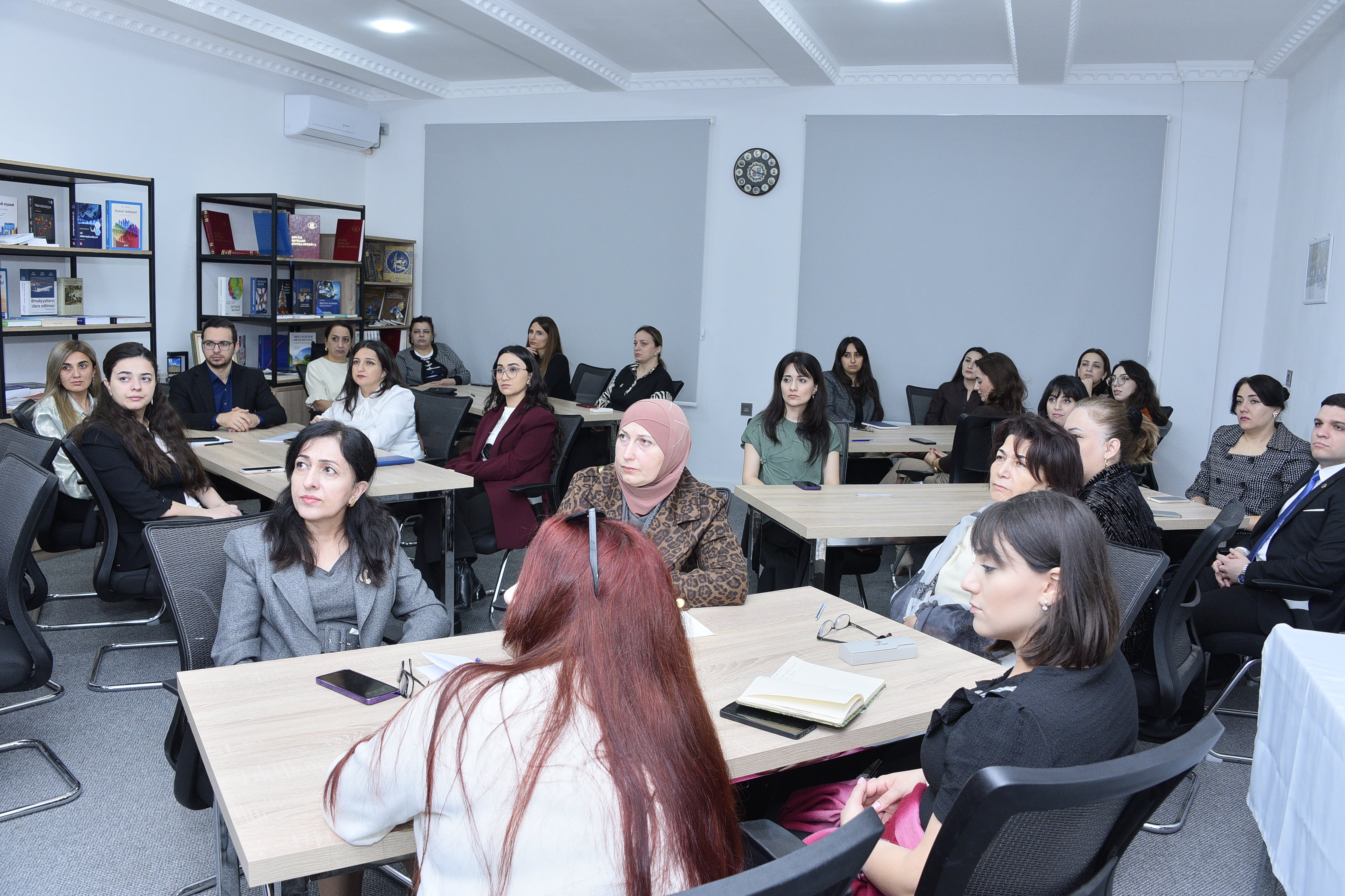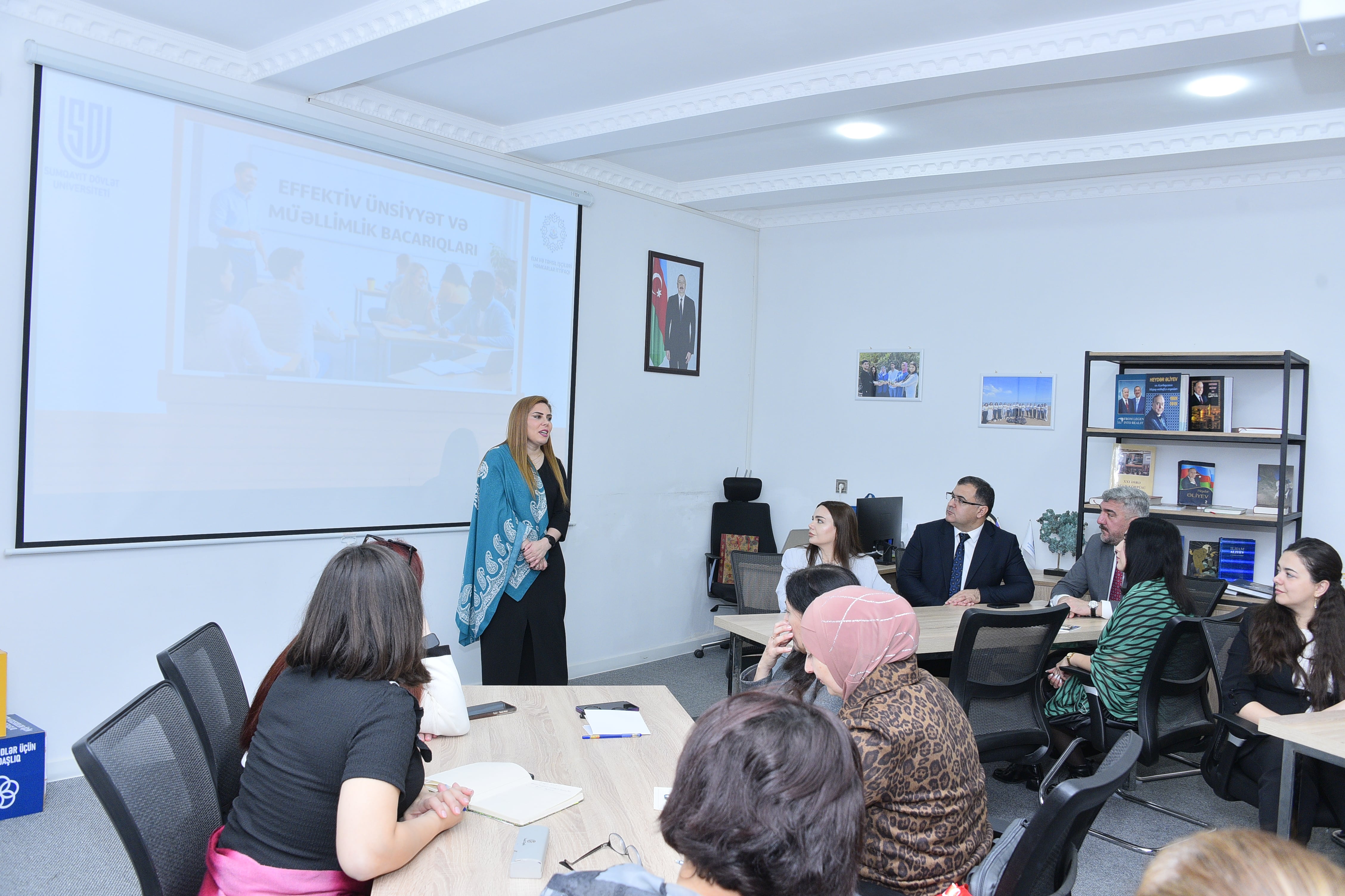 Noyabrın 27-də Sumqayıt Dövlət Universitetində (SDU) Həmkarlar İttifaqı Komitəsi və İnsan Resursları şöbəsinin birgə təşkilatçılığı ilə “Effektiv ünsiyyət və müəllimlik bacarıqları” mövzusunda təlim keçirilib. Tədbiri açan SDU-nun Sosial məsələlər və ictimaiyyətlə əlaqələr üzrə prorektoru, dosent Elmar Xəlilov belə təlimlərin müəllimlərin peşəkar inkişafında mühüm rol oynadığını vurğulayaraq, müəllim–tələbə kommunikasiyasının əhəmiyyəti və emosional yanaşma ilə səmərəli ünsiyyət qurulması məsələlərinə toxunub. Sonra Tədris Metodiki Mərkəzin əməkdaşı, təlimçi Aynurə Bağırova çıxış edərək, ünsiyyətin əsas prinsipləri, fəal dinləmə texnikaları, emosional intellektin kommunikasiya prosesindəki rolu, nitqin strukturlaşdırılması və auditoriya ilə effektiv əlaqə qurma üsulları kimi mövzular barədə danışıb. O, həmçinin bədən dili, jestlər, mimikalar və göz təması kimi elementlərin insan münasibətlərinin formalaşmasındakı əhəmiyyətini vurğulayıb. Təlim interaktiv formatda davam edərək, mövzu ilə bağlı maarifləndirici oyunlar təşkil olunub, iştirakçıların sualları cavablandırılıb, praktik nümunələr üzərində müzakirələr aparılıb.