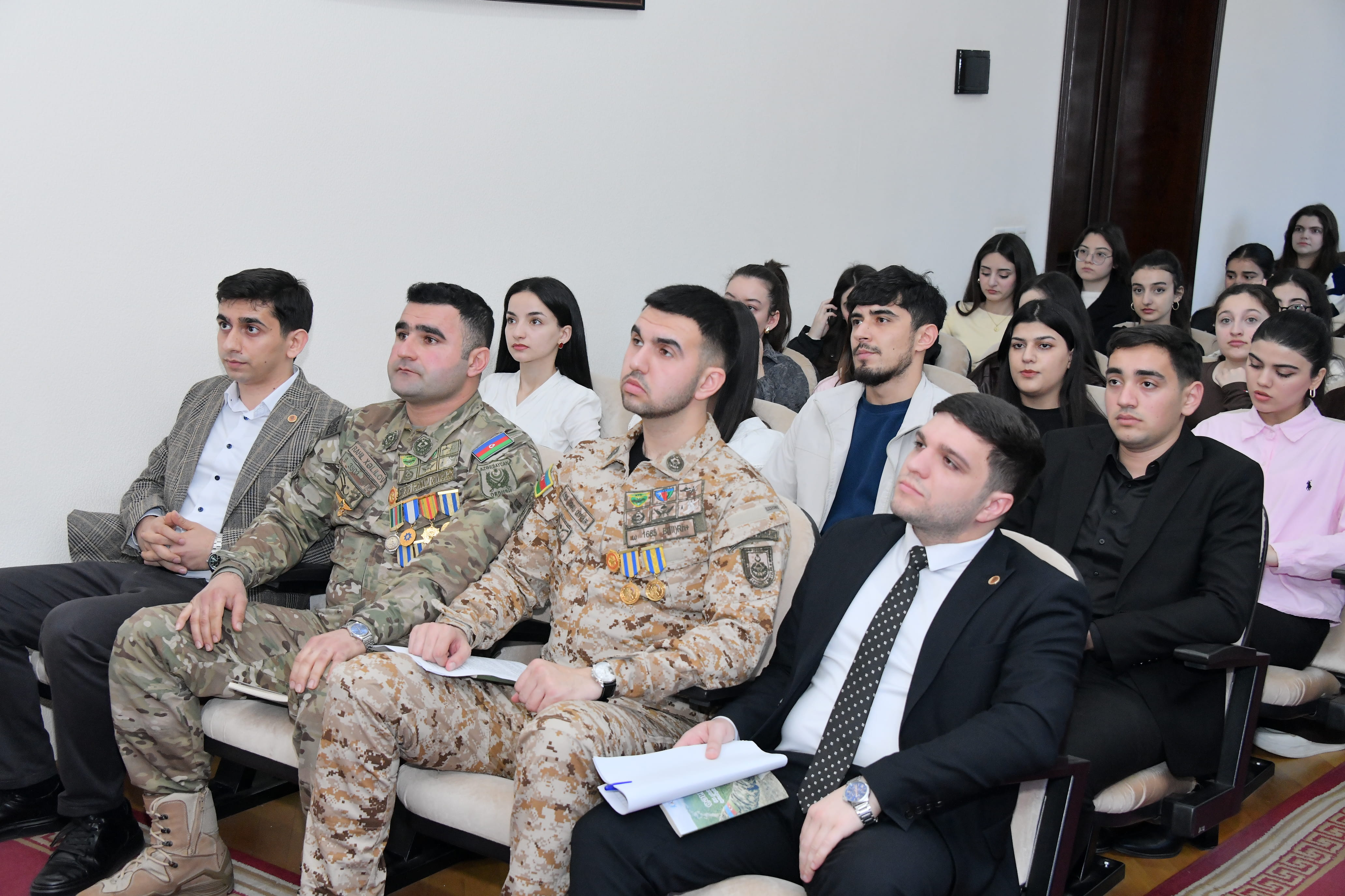 Universitetimizin qaziləri, Riyaziyyat fakültəsinin tələbəsi, peşəkar hərbçi kimi 44 günlük müharibədə müxtəlif rayonlarımızın azad edilməsində iştirak edərək Şuşa qələbəsinədək gedən Rahid Xəlilov, Təbiət elmləri fakültəsinin tələbəsi Hüsü Sarıyev çıxış ediblər.