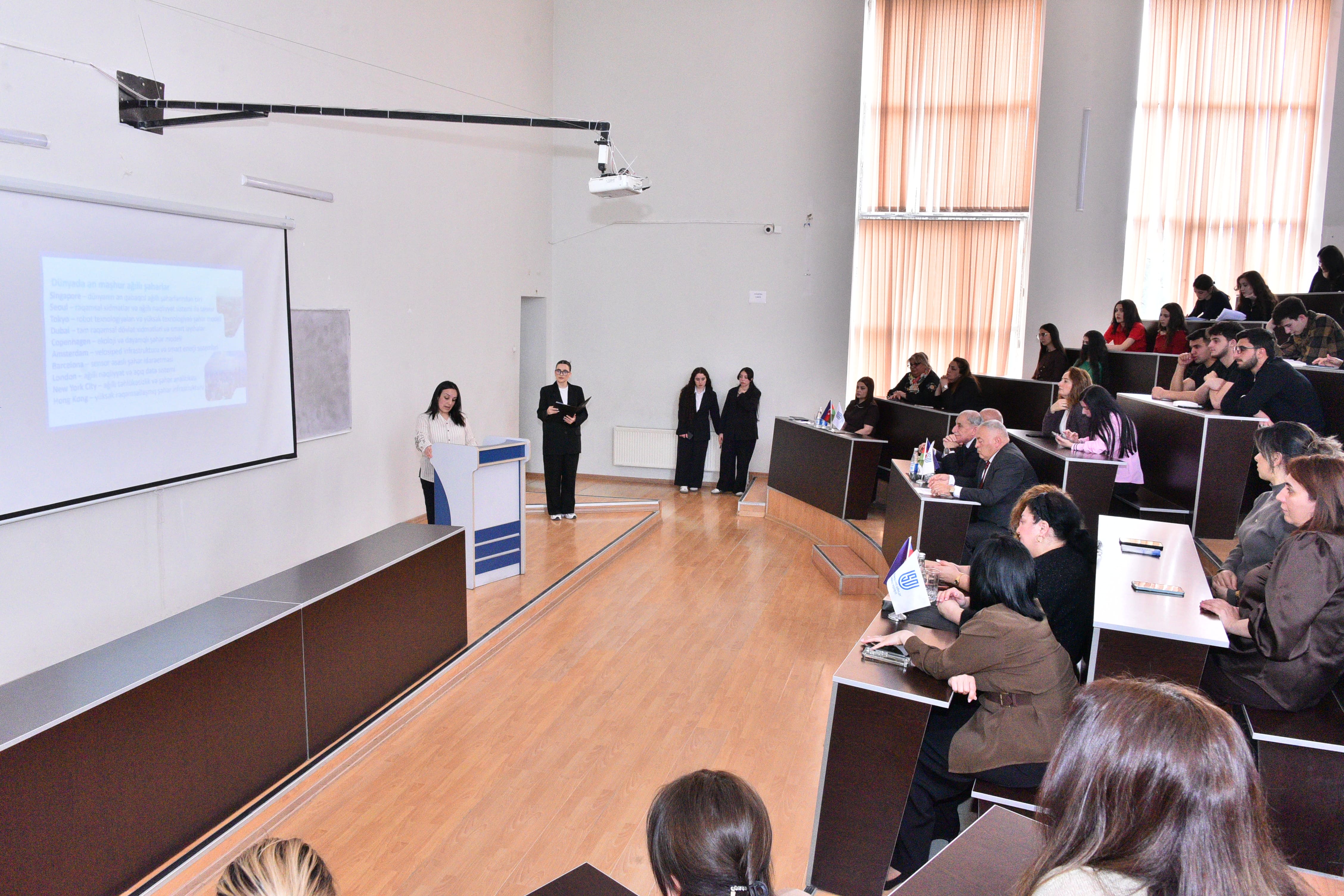 Sumqayıt Dövlət Universitetinin Riyaziyyat fakültəsi və fakültə üzrə Tələbə Həmkarlar İttifaqı Komitəsi (THİK), Tələbə Gənclər Təşkilatı (TGT) və Tələbə Elmi Cəmiyyətinin (TEC) birgə təşkilatçılığı ilə “Şəhərsalma və Memarlıq İli”nə həsr olunmuş “Şəhərsalma və memarlıqda riyaziyyat və informasiya texnologiyalarının rolu” mövzusunda elmi-praktik tədbir keçirilib. Tədbir fakültə üzrə THİK-in sədri Pəri Talıblının moderatorluğu ilə keçirilib. Tədbirdə Riyaziyyat fakültəsinin dekanı, dosent Xalidə Həsənova açılış nitqi ilə çıxış edərək bildirib ki, müasir dövrdə şəhərlərin inkişaf dinamikası, dayanıqlı urbanizasiya prosesləri, səmərəli planlaşdırma və innovativ memarlıq həllərinin tətbiqi riyazi modelləşdirmə, rəqəmsal texnologiyalar və informasiya sistemləri ilə sıx bağlıdır. O, bu istiqamətdə həyata keçirilən işlərdən, elmi yeniliklərdən və gələcək inkişaf perspektivlərindən bəhs edərək, bugünkü tədbirin mövzusunun həm elmi, həm də praktik baxımdan olduqca aktual əhəmiyyət kəsb etdiyini diqqətə çatdırıb. Sonra fakültə üzrə TEC-in sədri Zərifə Səmədzadənin təqdimatında Bakı şəhərinin 1930, 2026 və 2100-cü illərdə inkişaf mərhələlərini əks etdirən videoçarx nümayiş olunub. Təqdimatda paytaxtın keçdiyi tarixi inkişaf yolu və gələcəkdə gözlənilən şəhərsalma perspektivləri vizual şəkildə iştirakçıların diqqətinə çatdırılıb. Riyaziyyat və informatikanın tədrisi texnologiyası kafedrasının baş müəllimi Səbinə Qurbanova “Şəhər planlaşdırılmasında informasiya texnologiyalarının tətbiqi”, Riyazi analiz və diferensial tənliklər kafedrasının dosenti İlqar Səfərli “Şəhər nəqliyyat sistemlərinin optimallaşdırılmasında riyazi modellər” mövzularında təqdimatla çıxış ediblər. Onlar çıxışlarında ağıllı şəhər modellərinin və müasir proqram təminatlarının şəhər idarəçiliyində mühüm rolunu, şəhər planlaşdırılmasında real tətbiq imkanlarını, şəhər nəqliyyatının səmərəli təşkilini, hərəkət axınının optimal şəkildə tənzimlənməsini, eləcə də logistika proseslərinin təkmilləşdirilməsində riyazi modellərin əhəmiyyətini vurğulayıblar. Fakütə üzrə TGT-nin sədri Çinarə Osmanova “Gələcəkdən gəlmiş memar” mövzusunda çıxış edib. Tədbirin sonunda mövzu ətrafında maraqlı fikir mübadiləsi aparılıb, şəhərsalma və memarlıq sahəsində riyaziyyatın, innovativ yanaşmaların və informasiya texnologiyalarının tətbiqi ilə bağlı təkliflər irəli sürülüb.