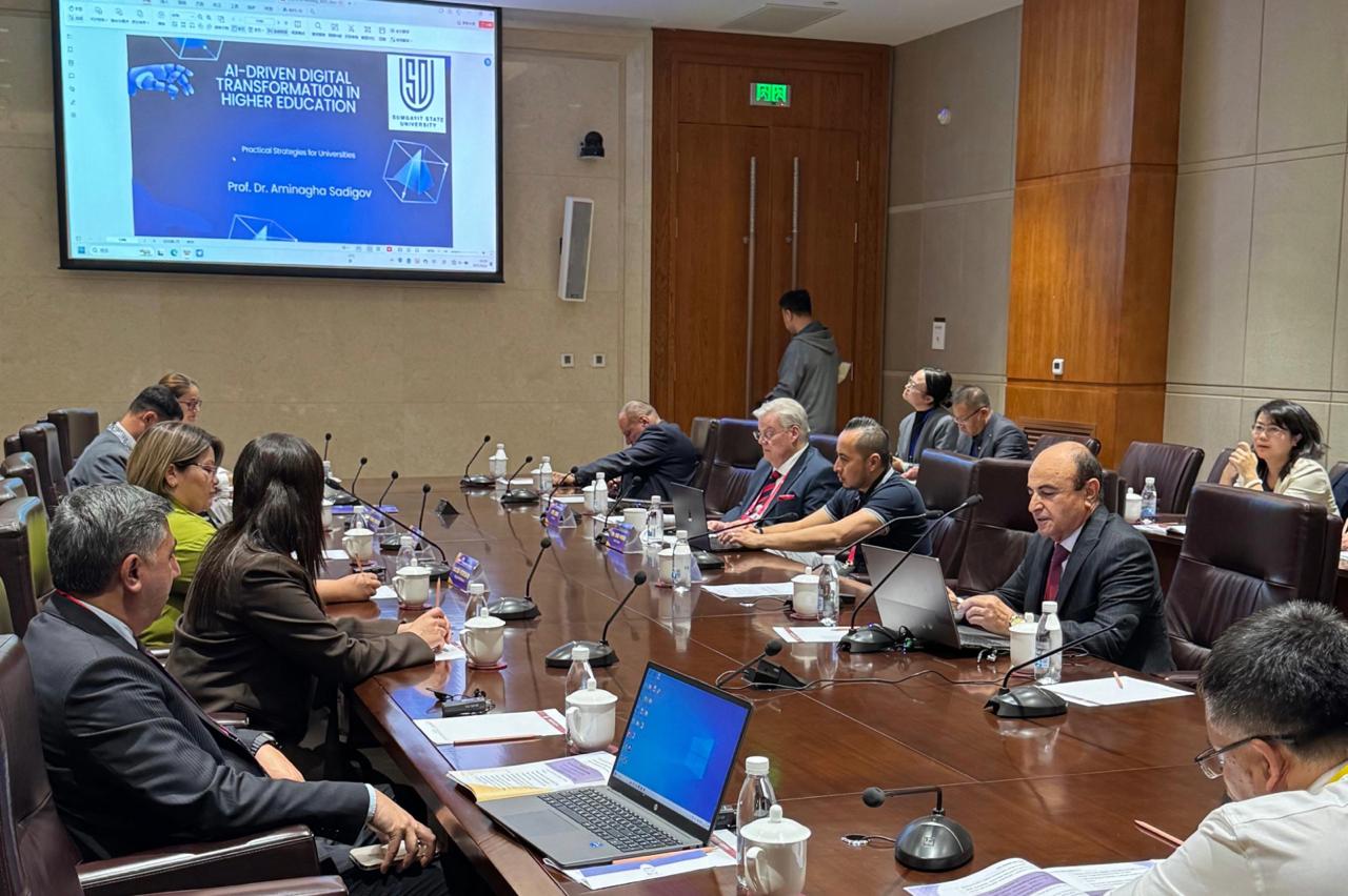 The Forum, dedicated to the theme "A Decade of Partnership, a Future Based on Wisdom: Creating a New Stage for the Belt and Road Education Community," brought together representatives from 95 universities from 24 countries around the world. Sumgayit State University (SSU) represents our country at this prestigious event. Professor Aminagha Sadigov, one of the keynote speakers at the forum, made a presentation on “Artificial Intelligence-Based Digital Transformation Practices in Higher Education: Practical Strategies for Universities.” He spoke about the application of artificial intelligence technologies in the educational process, the role of digitalization in university management mechanisms, and the importance of forming an innovative educational environment. Professor Sadigov noted that “The application of artificial intelligence technologies in higher education not only improves the quality of education, but also develops the creative potential of students and prepares them for the challenges of the global labor market. As Sumgayit State University, we are formulating our digital transformation strategy in accordance with these goals.” The SSU delegation also held a meeting with the leadership of Lanzhou University, the organizer of the Forum. The meeting discussed the prospects for future cooperation between the two universities in the direction of student-teacher exchange, joint research projects and support for startup initiatives. It was emphasized that the “Belt and Road Universities Alliance” serves to expand international relations between higher education institutions, promote scientific and innovative exchanges, and create new partnership opportunities in the global education space.