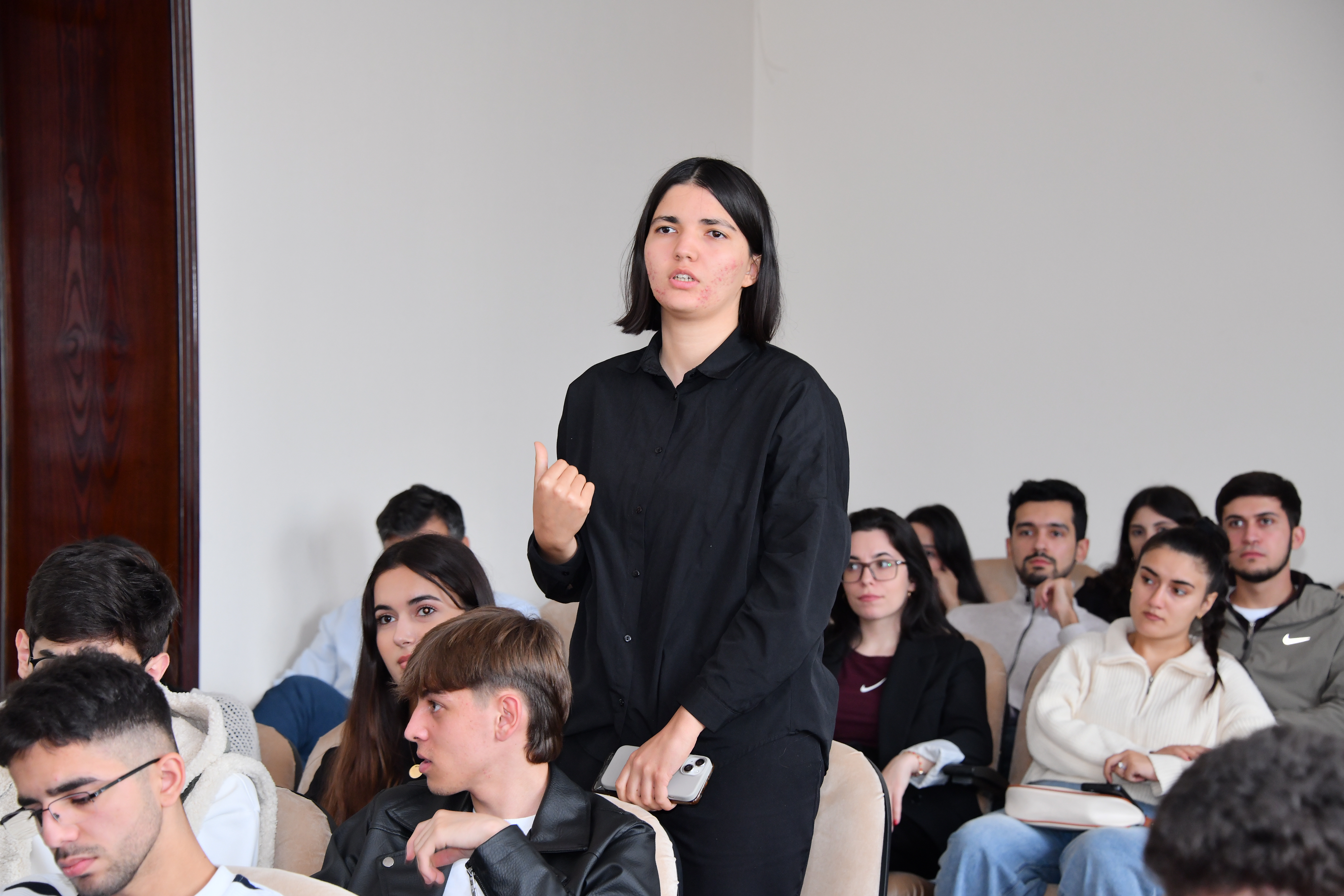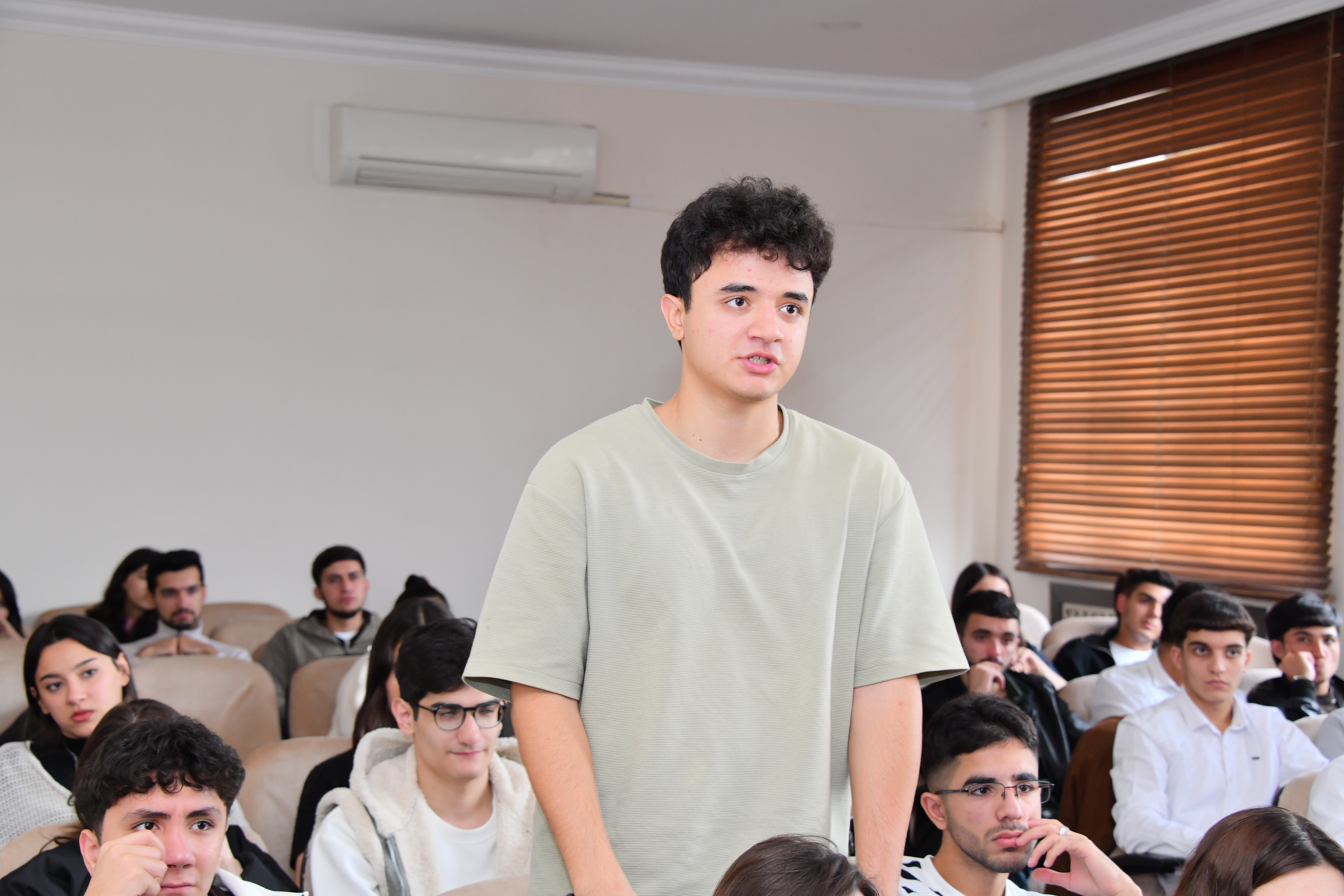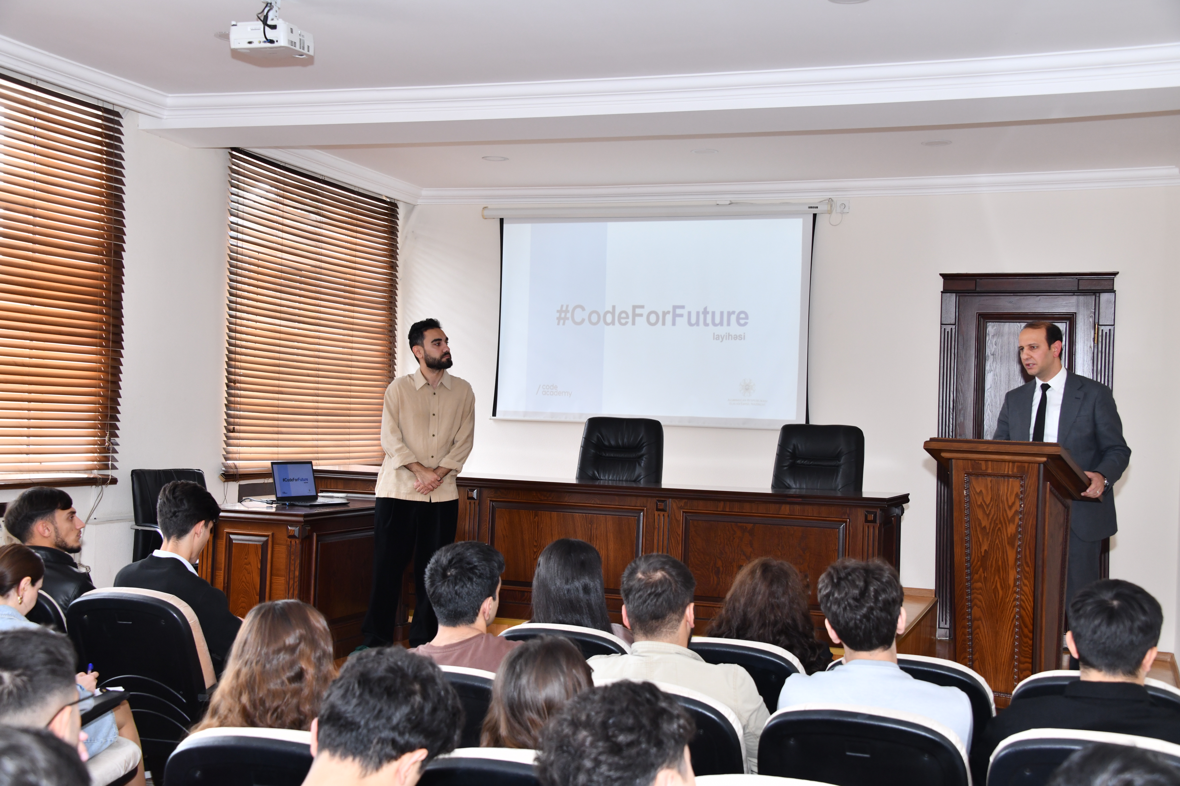 The event was opened by Vice-Rector for Science and Innovation, Associate Professor Elshad Abdullayev, who congratulated the students selected for Code Academy. He spoke about the importance of the project implemented by the Ministry of Science and Education in collaboration with Code Academy, emphasizing that students are provided with the opportunity to join the classes free of charge. Associate Professor Elshad Abdullayev advised students to continuously improve their knowledge and successfully complete the course with the highest results. Then, Shahriyar Mammadli, education manager of the Code For Future project, spoke and provided information about the academy's activities, educational programs, and opportunities created for students. He noted that the academy teaches students knowledge and skills that are relevant to the demands of the real labor market, which turns them into competitive and professional IT specialists in the future. He also mentioned the opportunity for free education in the specialties of "Artificial Intelligence-assisted Programming" and "Fundamentals of Cybersecurity". He emphasized the importance of students being more responsible in class and continuously developing their knowledge and skills. At the end of the event, a mutual exchange of views took place, and the questions asked by the students were answered by Shahriyar Mammadli.