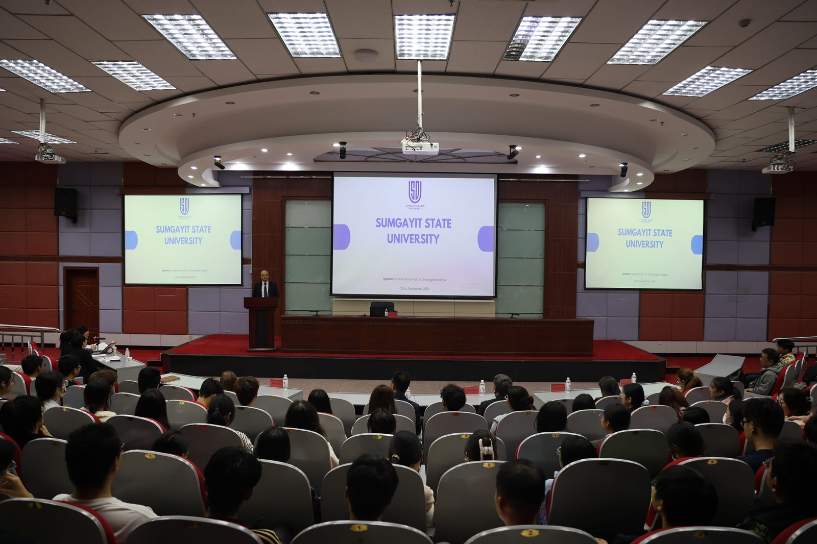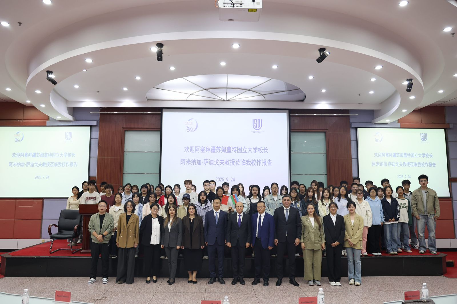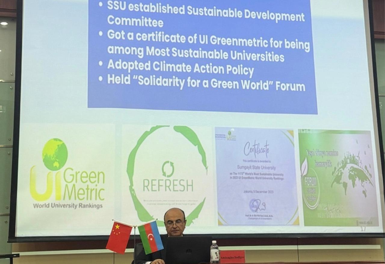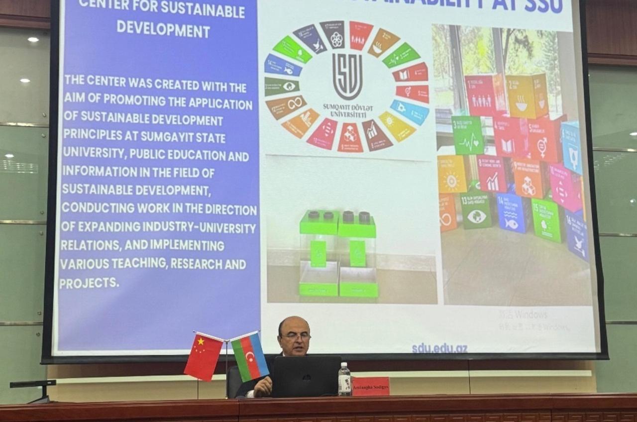 On September 24, the acting rector of Sumgayit State University (SSU), corresponding member of ANAS, Professor Aminaga Sadigov, made a presentation to the faculty and students at Hexi University in Zhangye, as part of his visit to the People's Republic of China. During the presentation, Professor Aminaga Sadigov provided detailed information about SSU's educational programs, main academic directions, existing laboratories, and participation in international rankings. He also spoke about the projects and initiatives implemented by the university in the field of sustainable development. In his speech, he made a comprehensive presentation on the work done at the university in accordance with the UN Sustainable Development Goals (SDGs), the established Sustainable Development Center, startup projects, membership in international networks, activities carried out under the 17 SDGs, promoted initiatives, and established partnerships. The presentation was met with great interest among the students, their numerous questions were answered during the meeting, and future cooperation prospects were discussed between SSU and Hexi University.