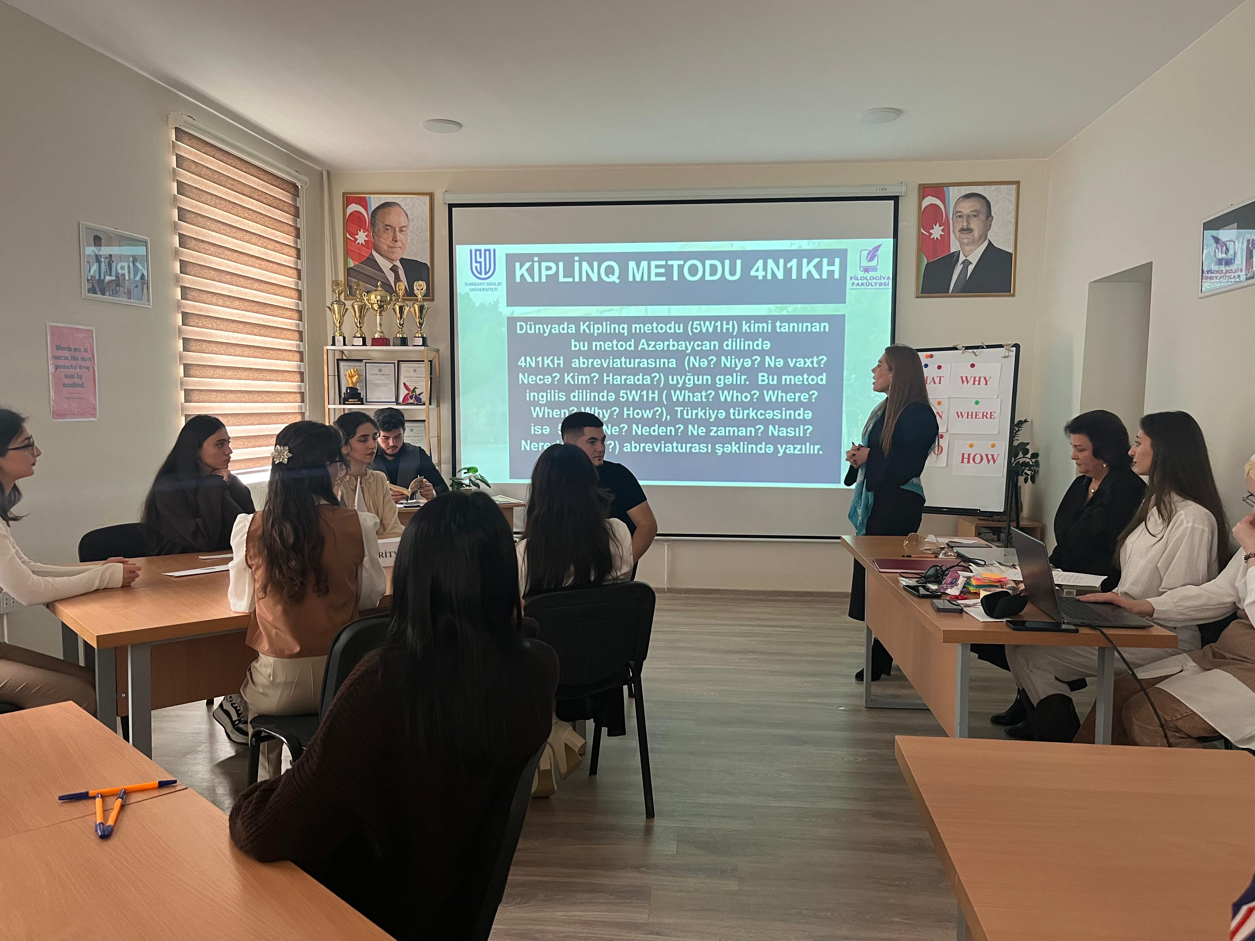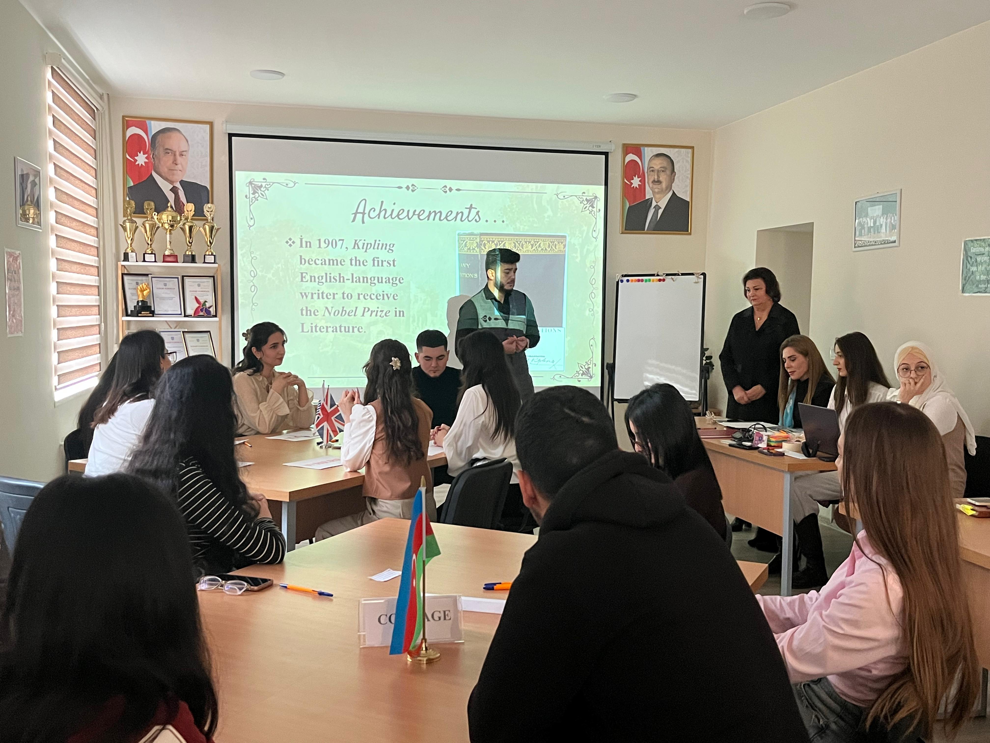 On December 18, a joint lesson on the topic “Kipling Method in Modern Education” (5W1H), dedicated to the 160th anniversary of the birth of the outstanding representative of world literature, Nobel Prize laureate Rudyard Kipling, was held at the Faculty of Philology. The lesson was conducted by Saadat Khalilova, senior lecturer of the Department of Foreign Languages, and Aynura Bagirova, senior lecturer of the Department of Language and Literature. At the event, Kipling’s life and work were presented on the basis of modern teaching approaches, and the possibilities of applying the 5W1H method in the pedagogical process were demonstrated. During the lesson, which was held in an interactive format, special attention was paid to the development of students’ analytical and critical thinking, and skills in working with text. The lesson, which was important in terms of interdisciplinary integration and innovative learning strategies, increased students’ interest in the topic and concluded with a reflection stage. The event was attended by Associate Professor Gunel Pashayeva, Dean of the Faculty of Philology, Jala Mammadova, Head of the Department of Foreign Languages, Associate Professor Boyukkhanim Eminli, Head of the Department of Language and Literature, and the faculty's teaching staff.