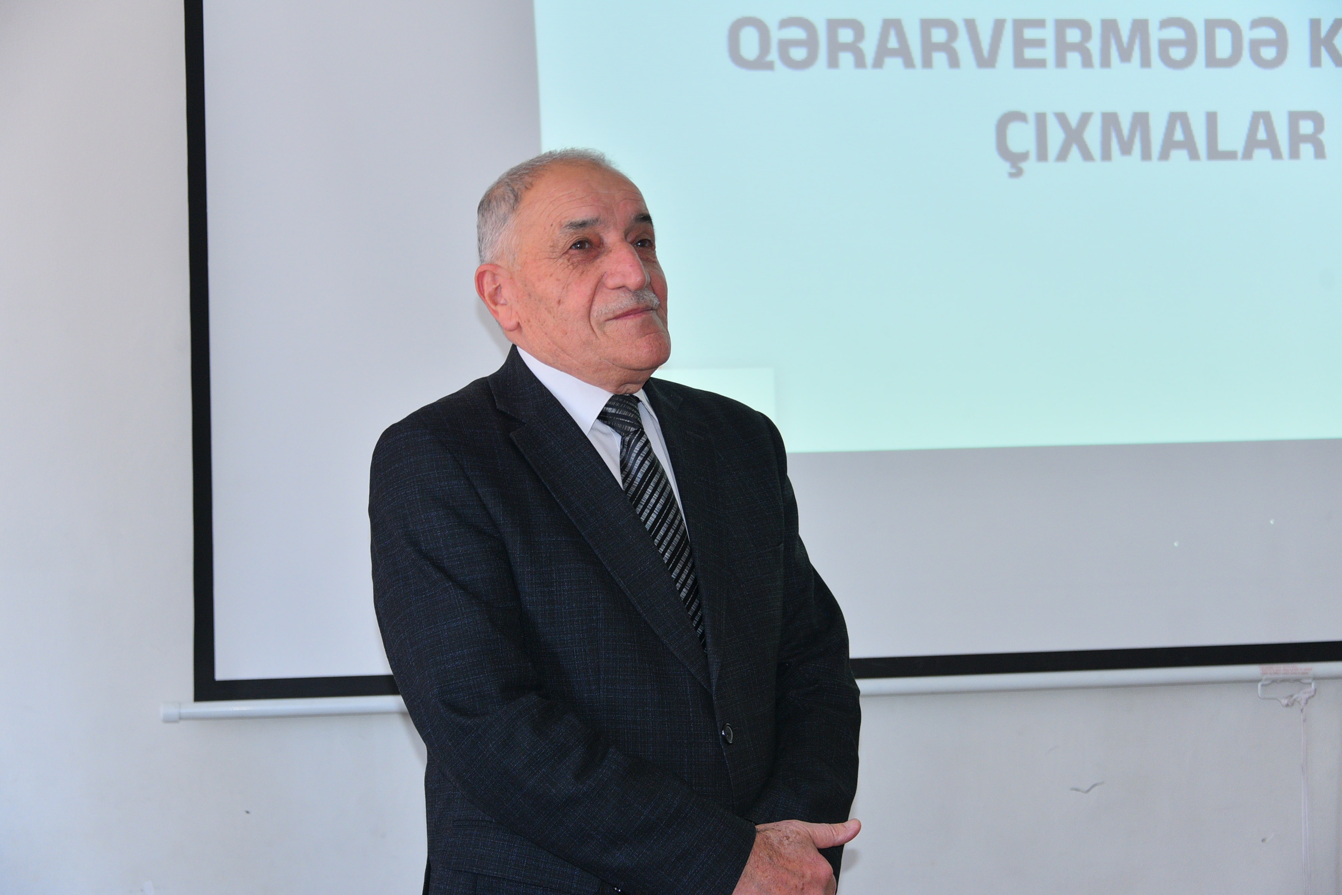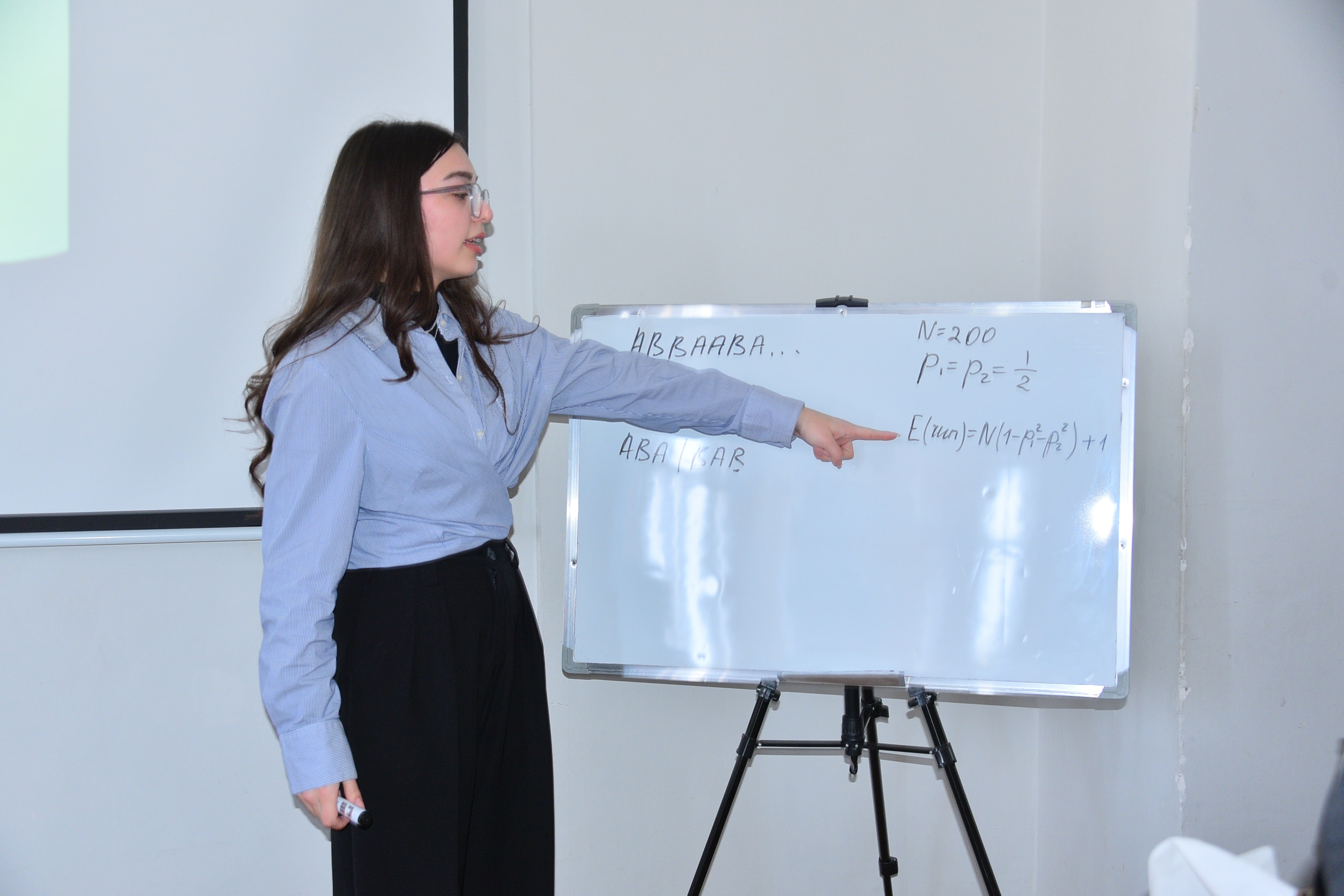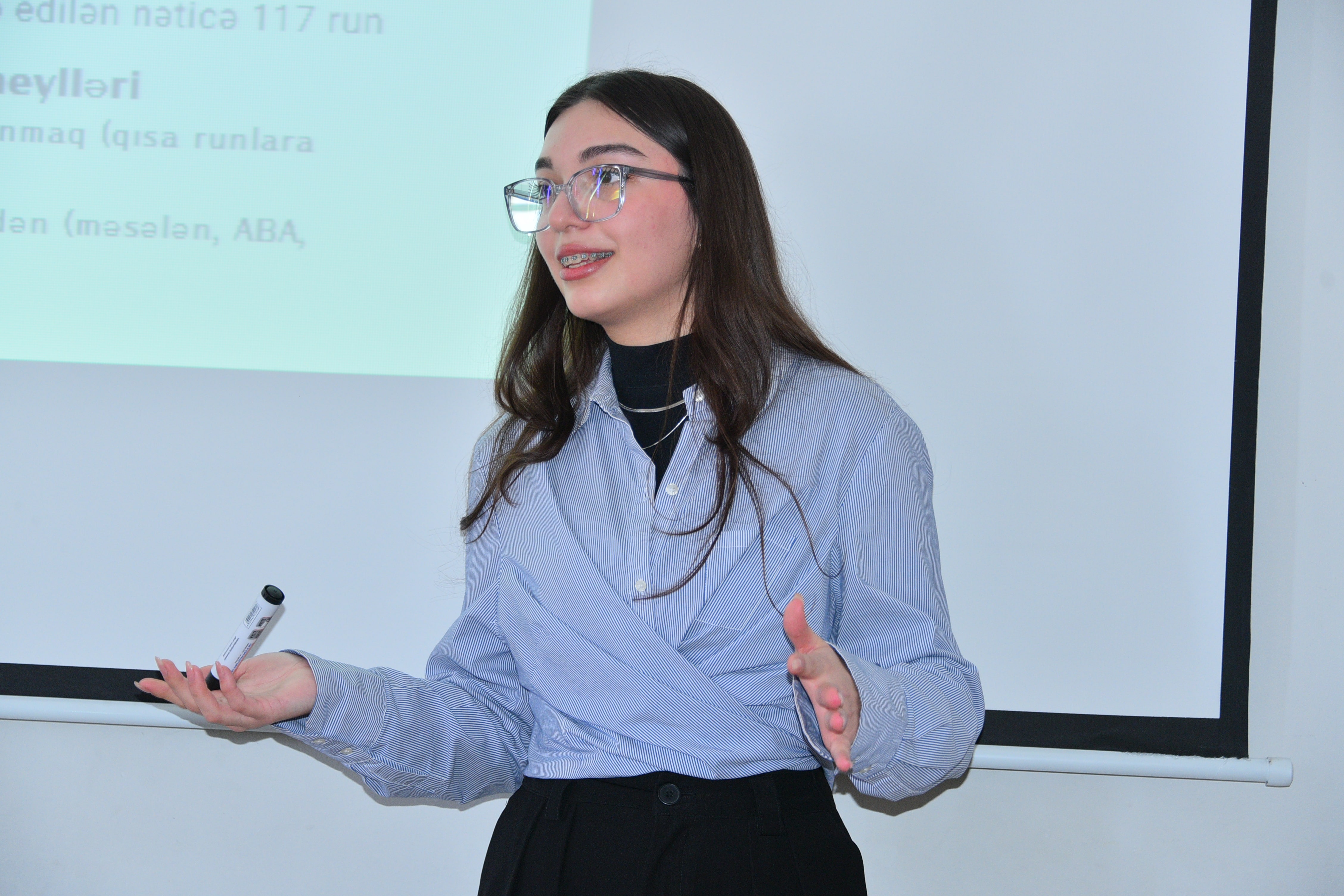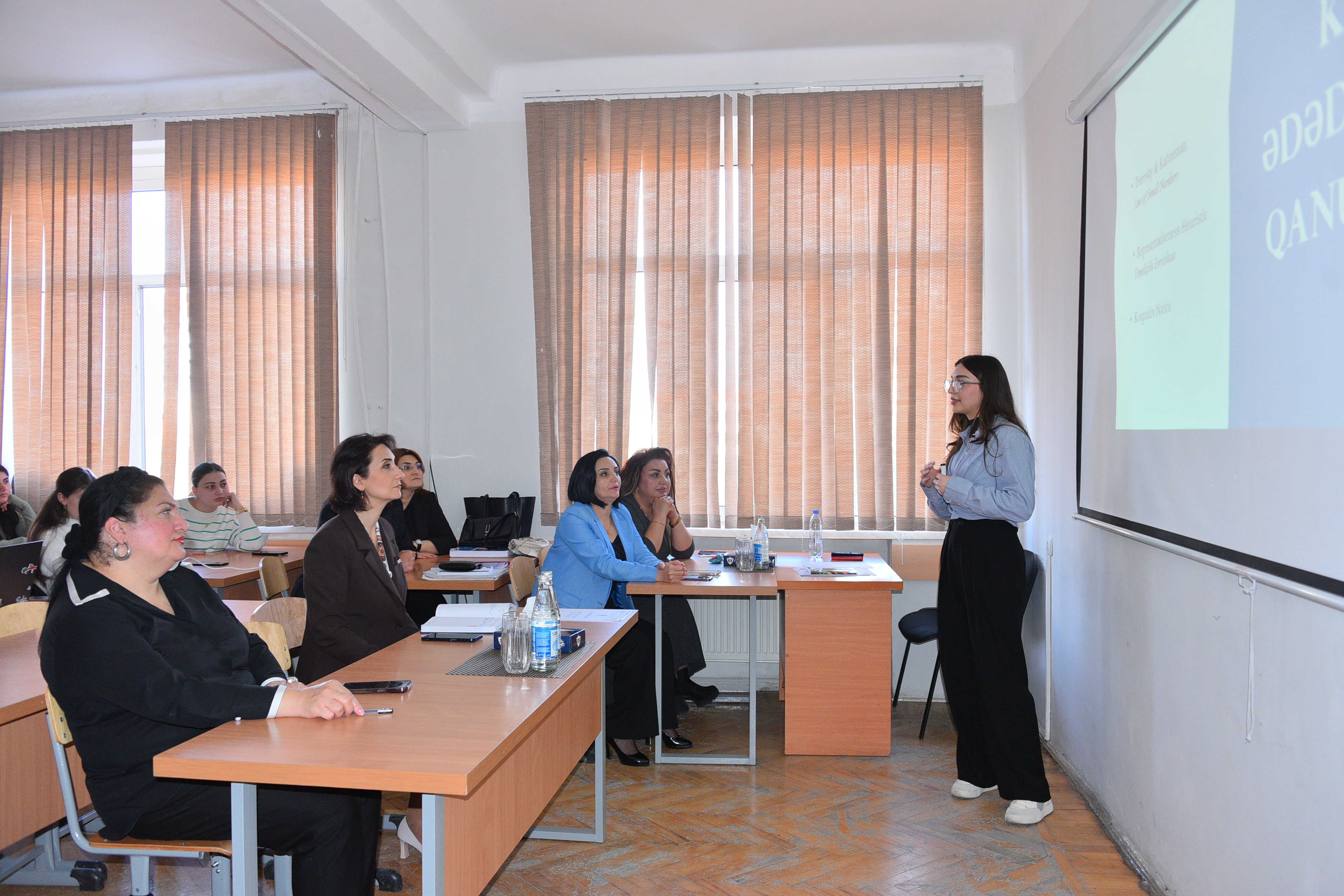 The report prepared under the guidance of the scientific supervisor, Associate Professor Khalil Aliyev, was presented by a third-year student of the Faculty of Mathematics, Guldeste Mammadova. She presented the results of her research on the topic “Decision-making deviations in probability theory”. She answered the questions of teachers and students.